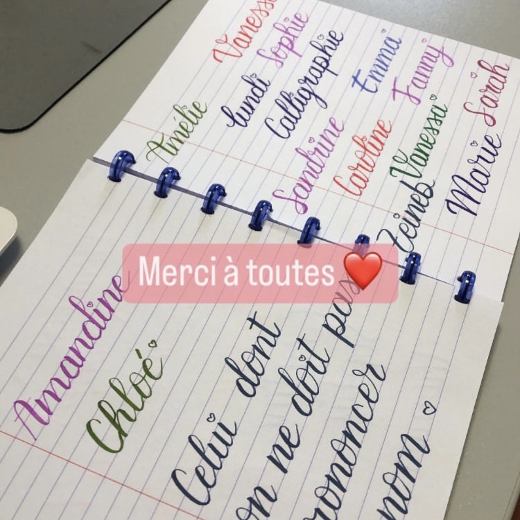 Pour ma part, je poste régulièrement sur Instagram mes exercices où je vous invite à m’envoyer des mots à calligraphier (comme sur la dernière photo avec vos prénoms).
