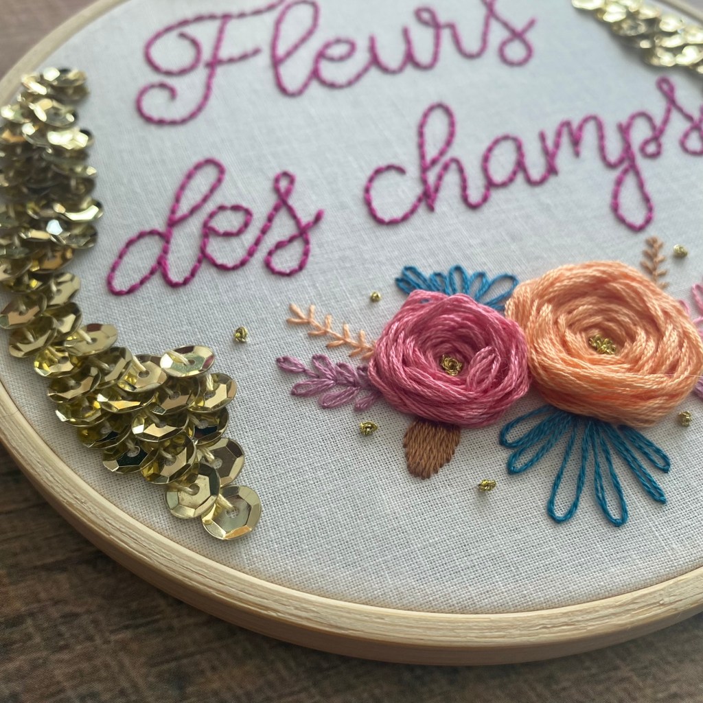Comme pour toutes mes propositions de broderie, je vous propose un dessin épuré, des lignes simplifiées et des points très simples à réaliser. Un point arrière pour le texte et des points avant (ou arrière) pour le feuillage. Enfin, un tout petit peu plus complexe, le point de nœud pour les petites boules dorées, un point boucle pour les grandes feuilles et un système un peu particulier pour les roses.